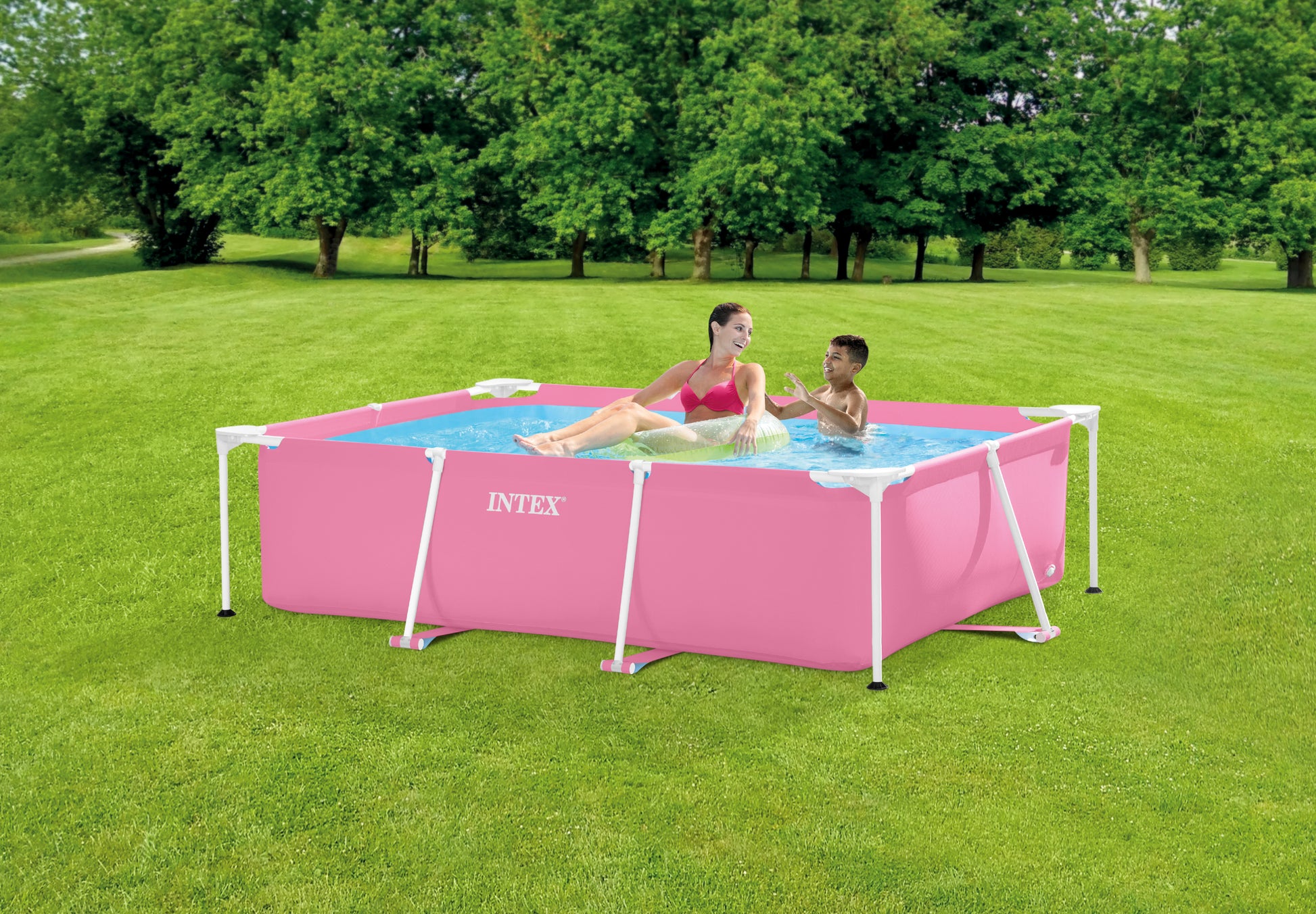 Splash away in our new Pink Rectangular Frame Pool! Perfectly sized for smaller spaces and families, this pool is supported by strong, durable steel frames and laminated sidewalls. Added features include a convenient drain plug and connection holes for optional filter pumps. Pink paradise awaits!